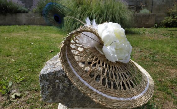 Voici un chapeau de mariage chic et champêtre ! Conçu sur un support en paille naturelle, il est agrémenté de plumes de paon et d’autruche et arbore deux volumineuses fleures artificielles. Subtil équilibre entre l’élégance des plums rafinées et la sobriété des éléments de la nature : paille et fleures. […]